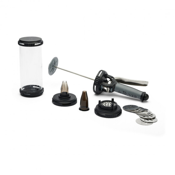 Livré avec kit spécial sablés, composé de deux couvercles hermétiques, d’un bouchon/support disque et de 13 disques amovibles en acier inoxydable pour la réalisation de sablés variés et originaux, et pâte à choux.