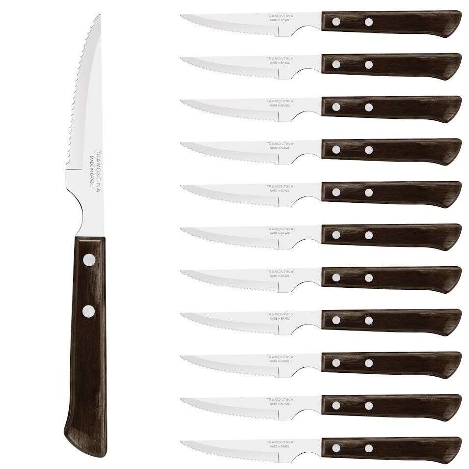 Titre optimisé | TRAMONTINA- Ensemble 12 Couteaux à Steak Spanish 22cm marron- Inox et Technobois – Précision de coupe, Résistance et élégance, Tranchant exceptionnel, Passage au lave-vaisselle, couteaux de table |