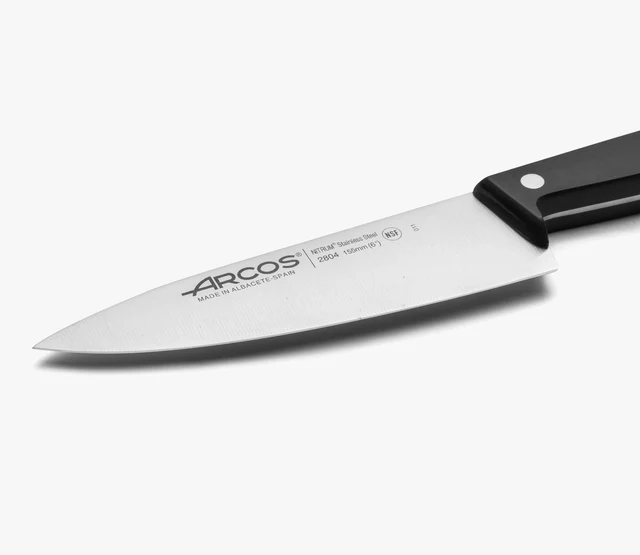 Le couteau de chef de la collection Universal 155 mm avec une lame large en acier inoxydable, rigide et robuste pour un usage domestique et professionnel.